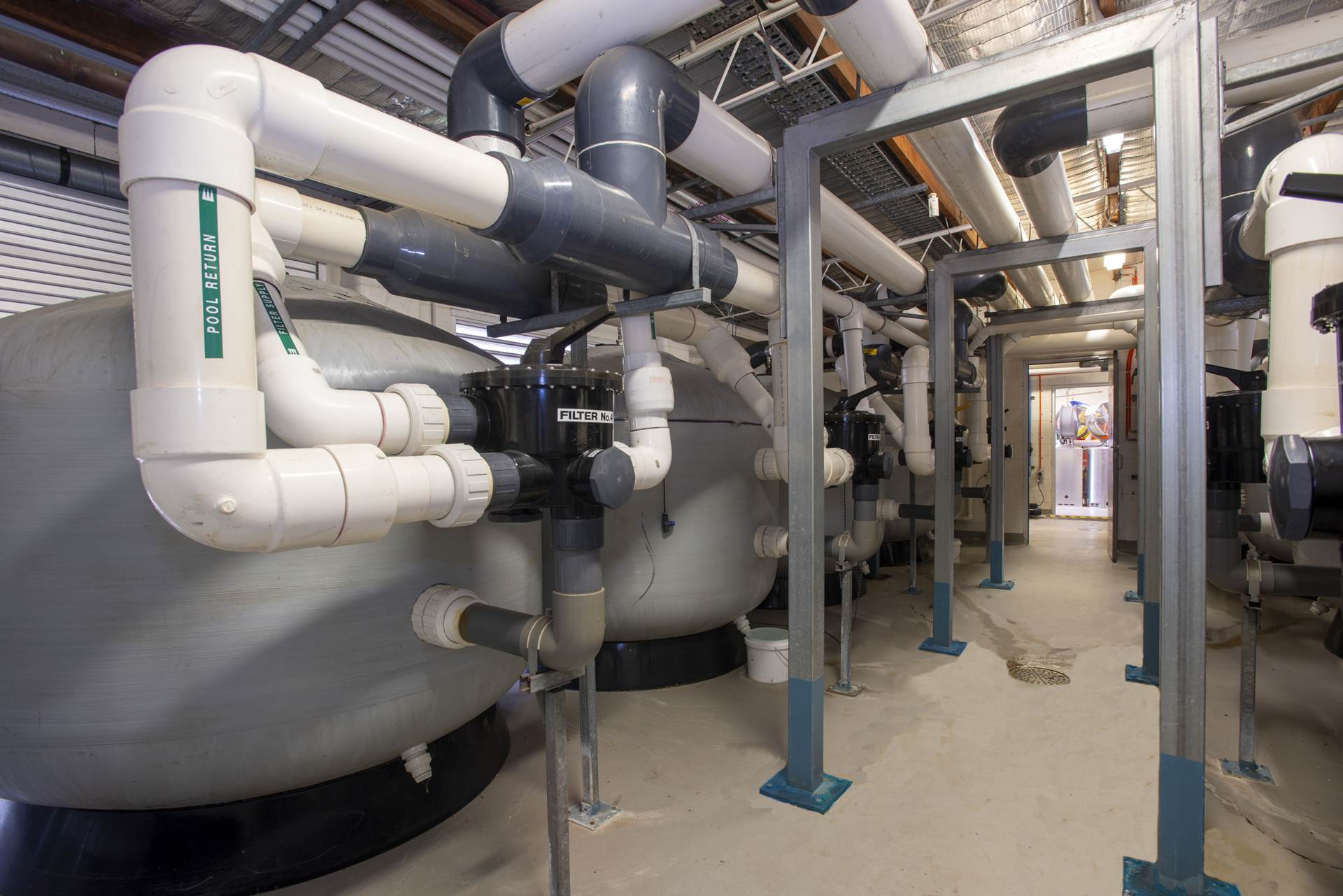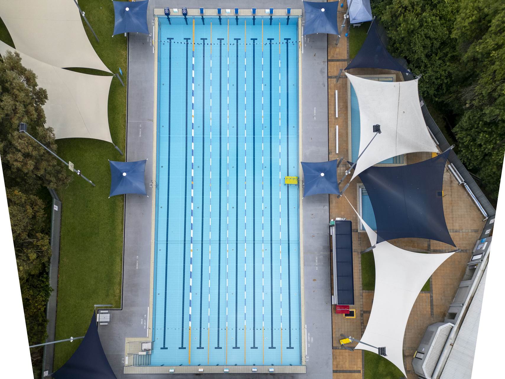 50m x 20m Olympic size pool, 2m to 1m depth, fully tiled using Agrob Buctile commercial tiles, wet edge with balance tank, lane rope anchors and lane ropes, lane rope reels, prominent chemical dosing system with CO2 liquid chlorine & liquid acid, sand filtration, 2 gas heaters, backwash tank, tiled internal steps with stainless steel rails and ll signage to South Australian Health Commission regulations.